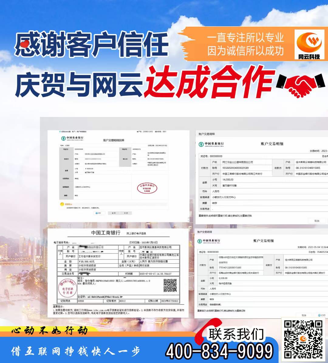 感謝客戶信任,慶賀與網(wǎng)云達(dá)成合作!!一直專注所以專業(yè),因?yàn)檎\(chéng)信所以成功,選擇網(wǎng)云,選擇靠譜,心動(dòng)不如行動(dòng),借互聯(lián)網(wǎng)掙錢快人一步。